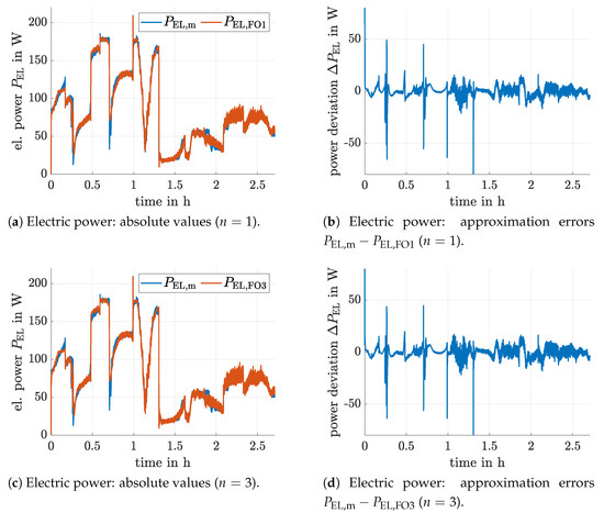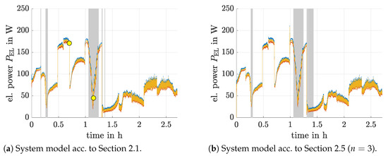 In Figure 11, it is shown exemplarily for the static neural network model as well as for the proposed fractional-order system representation that the Kalman filter according to Section 3 can identify regions, where the operating point overshoots the point of maximum electric power. Note, all system inputs of the evaluated models are given by the experimental data depicted in Section 2.