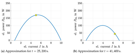 Figure 12 analyzes the previous statements concerning the overshoot detection with respect to the maximum power point in more detail. Setting the mass flow equal to the measured values at two selected points of time, see Figure 11a, the local quadratic approximations of the power characteristic can be depicted as function of the stack current. Obviously, Figure 12a represents an operating condition, where the system is close to its maximum power point, while in Figure 12b a reduction of the stack current (and/or, respectively, increase of the hydrogen mass flow) would be necessary to ensure the operation in the regime of Ohmic polarization.