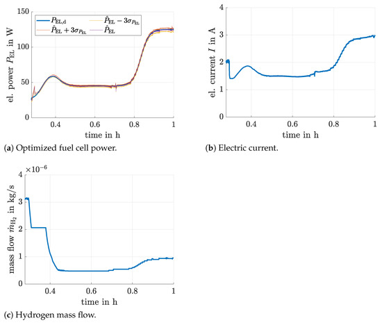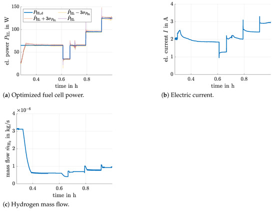 Moreover, the further parameters used for the optimization in the following section are and . Due to the relatively long time constants for variations of operating points in SOFCs, the optimization procedure is evaluated each second, i.e., at each tenth sampling point of the Kalman filter. It performs an underlying check whether the inequality (28) can be expected to be satisfied in the following time step. If not, the electric current is reduced. To avoid too large update steps by the previously introduced scaling factor , this value is reduced if the update leads to mass flow variations that exceed of the current amount of supplied hydrogen. Moreover, the hydrogen mass flow is kept constant if the gradient-based update rule suggests its reduction in cases when its current value is only larger than the limit given in (31). Then, only adaptations of are performed.