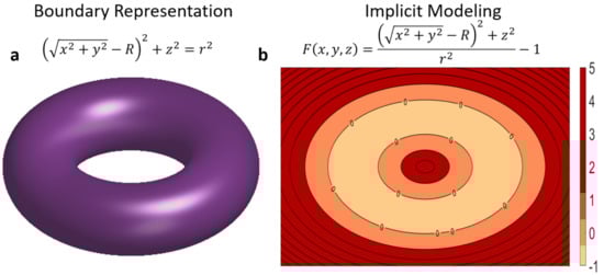 (a) B-rep representation of a torus (b) Implicit modeling of a torus as a signed distance field where F < 0 indicates part, F = 0 indicates boundary, F > 0 indicates void.