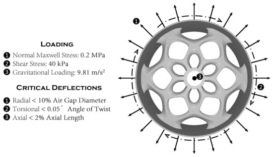 Three main forces act on the rotor during operation seen in Figure 2. Due to its low speed (8–15 rpm), a high torque exists which is the useful work to produce electricity. Due to electromagnetic interactions, a normal component of the Maxwell stress acts radially outward. Finally, gravity acts on the entire structural and cannot be neglected due to the large mass of a PMDD generator. Load values used in this study agree with those used in the literature for a 5MW radial flux (RF) PMDD machine [4,36]. The normal component of the Maxwell stress was assumed to be 0.2 MPa, the shear stress arising from the torque 40 kPa, and a gravitational acceleration of 9.81 m/s2. The 5 MW deflection criteria were determined such that the radial deflection was less than 10% of the air gap diameter (to avoid closing the airgap), the torsional deflection less than 0.05 angle of twist (to prevent shear failure), and the axial deflection less than 2% the axial length (to prevent transportation damage). For our 5 MW machine this results in a maximum radial, torsional, and axial deformations of 0.65, 2.84, and 32.17 mm, respectively. For FEA analysis, the rotor was assumed to be homogeneous and isotropic and made out of structural steel with an elastic modulus of 200 GPa, Poisson ratio of 0.28, and density of 7850 kg m−3. The rotor was assumed to be well cooled and thermal effects assumed to be mitigated.