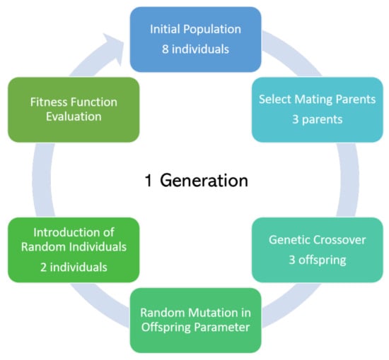 For the GA, first, a random population with seven chromosomes representing the seven parameters was initialized. Next, a given number of individuals were selected to mate with a central chromosome crossover point. Mutations were introduced in these offspring randomly impacting one parameter. To increase randomness, two randomly generated individuals were added to the population pool. Finite element analysis was used to calculate deflections and mass in order to determine each individual’s fitness score (Equation (7)). A given number of individuals with the lowest fitness score were then selected as parents to begin the process again and the cycle repeated 200 generations to ensure convergence.