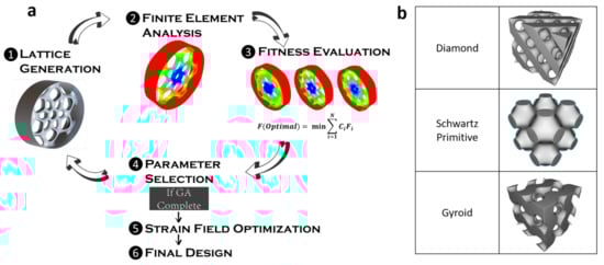 (a) Optimization scheme combining FEA and lattice generation with genetic algorithm (b) Visualization of three lattice types used in implicit optimization.
