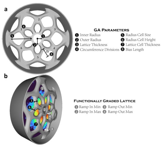 To fully take advantage of additive manufacturing, components must be optimized for functionality. Two main optimization approaches are parameter optimization and topology optimization. The first [29,30], takes a given number of inputs and uses any deterministic or stochastic optimization scheme in order to iterate parameters towards an optimal solution. This includes genetic algorithms, particle swarm approaches, and Monte-Carlo analysis. The former [31,32,33,34], uses a numerical process to add or remove material penalizing for discontinuous or disadvantageous structures while simultaneously calculating the strain field in order to minimize or maximize an objective function. The typical structural compliance problem has two conflicting conditions, for example, maximizing stiffness while minimizing mass where an optimal condition exists with the maximum stiffness at minimum mass. Theoretically, a topology optimized approach should achieve a global minima or maxima; however, many times, convergence leads to local minima. In this case, a different approach is needed. Daynes et al. [35] combined both methods by using topology optimization to remove unnecessary material and then applied a strain optimized lattice structure from finite element analysis (FEA) results to reduce compliance of a bracket by 13% and improve manufacturability. This study employs a genetic algorithm variant for parameter optimization coupled with implicit modeling to control the topology of complex lattice structures for PMDD generator inactive mass.