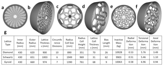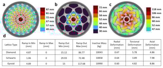 After functionally graded lattice optimization, radial deformations for the Diamond, Schwartz Primitive, and Gyroid TPMS lattices were 0.67, 0.64 and 0.60 mm, respectively. Torsional deformations were 5.78, 3.89, and 4.82 mm, respectively. Axial deformations were 4.86, 7.98, and 8.86 mm, respectively. Inactive mass was 10,043 kg for the Diamond lattice, 10,858 kg for the Schwartz Primitive lattice, and 10,990 kg for the Gyroid lattice. Tabulated results with each TPMS strain field ramp parameters and the corresponding optimized lattice with lattice thickness overlaid can be found in Figure 7.