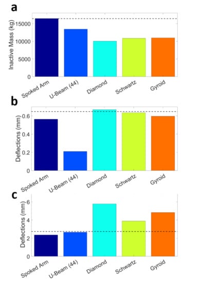 Results of the parameter optimization for each minimal surface as well as the corresponding design is given in Figure 6. The Diamond, Schwartz Primitive, and Gyroid TPMS lattices had a total inactive mass (mass only for structural support—the inner ring and lattice) of 10,928, 9903, and 10,063 kg, respectively. The reference mass of the 5 MW spoked arm rotor was 16450 kg with a radial, torsional, and axial deflection of 0.56, 2.36, and 0.20 mm, respectively [36]. Radial deflections were 0.53 mm for the Diamond TPMS, 0.51 mm for the Schwartz Primitive TPMS, and 0.58 mm for the Gyroid TPMS. Torsional deflections for Diamond, Schwartz Primitive, and Gyroid TPMS lattices were 5.76, 5.46 mm, and 6.96 mm, respectively. Axial deflections were well below the critical limit of 32.17 mm and were 3.49 mm for Diamond, 1.10 mm for Schwartz Primitive, and 0.94 mm for Gyroid TPMS lattices. The parameter optimization of all three minimal surfaces resulted in up to 40% inactive mass savings from the spoked arm design; however, the torsional deflection for all three was above the deflection criteria of less than 0.05 angle of twist (2.84 mm).