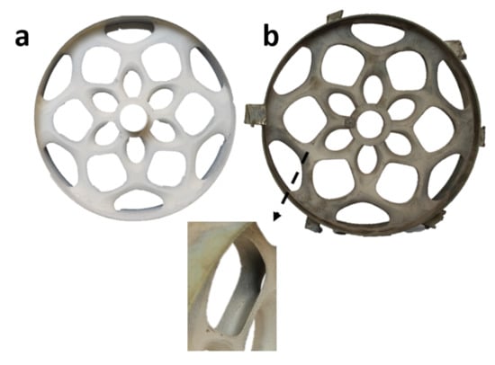 In this study, proof of hybrid manufacturing was carried out with investment casting of a wax fused deposition modeling (FDM) printed model. First, a Raise 3D printer with Polycast filament was used to create a 285 mm scaled version of the genetic algorithm parameter optimized Schwartz rotor. Next, the model was processed through standard investment casting procedures. This included creating a silica shell, burnout of the wax model, and firing before pouring for smooth metal flow. The FDM part and final bronze part can be seen in Figure 9. Casting was done in bronze due to its wide availability and lower prototyping cost than stainless steel. Successful casting of an FDM model suggests much finer resolution can be achieved with a wax material jetting printer. This also validates the ability of metal flow in casting of complex TPMS geometries. This is particularly important as smaller parts are expected to be more difficult to manufacture with this hybrid method due to metal flowability. Successful manufacturing of a 285 mm part suggests the feasibility of scaling this technique. It is expected that powder-binder jetting and wax printing would enable better results due to their finer resolutions than FDM. A Cartesian Gyroid and Schwartz rotor with internal features were also successfully cast (Figure S5). For large scaled up rotors, a combination of casting structural support and directed energy deposition active material could be used to combine the large throughput of casting with more precise additive techniques for inactive and active generator materials [45].