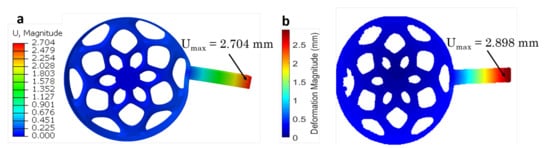 Due to their large sizes and mass, it is difficult and expensive to experimentally validate the TPMS structural designs in structural steel in a lab setting. However, due to the complexity of the TPMS geometries, experimental deflection validation is necessary for confidence of the FEA results. In order to accomplish this, the Schwartz Primitive parameter optimized design was printed with PLA filament on an FDM printer scaled to 200 mm outer diameter (Figure S6). We assumed in the elastic regime the only difference between metal and PLA rotors will be the material properties and thus the TPMS geometry can be validated with PLA instead of structural steel. A torque arm and shaft were concurrently printed and 100% infill used in order to create as isotropic a part as possible. A 2.3504 kg mass was hung off the torque arm to provide a force (23.06 N) and the shaft was clamped in a vice to prevent motion. Digital image correlation was used to capture the 2D full field deflection map and compared to Abaqus FEA results with the same loading conditions. The maximum deformation magnitude was used as comparison between FEA and DIC results. The FEA results predicted a maximum deformation magnitude of 2.704 mm while DIC found 2.898 ± 0.083 mm (Figure 10). This is a 6.7% difference which can be explained by irregularities in the printed part and anisotropy of the 3D printed part. These results validate the FEA model and provide justification to FEA modeling of the TPMS lattice structures. DIC and FEA results focused on the lattice structure response to loading can be found in Figure S7 and further agree with one another.