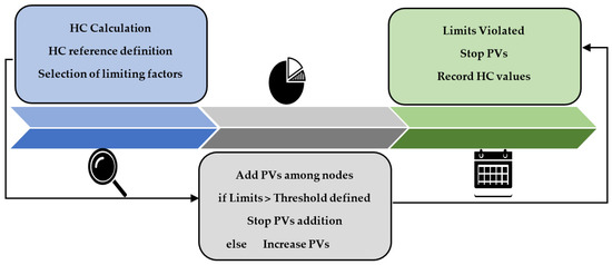 The maximum PV HC was strongly influenced by network loading. This part of the work was focused on the determination of the impacts of variation of maximum loading of the network on the PV HC of the network. The HC results for two loading levels are given in Table 6. This analysis shows how different limiting factors of the HC manifested themselves under varying loading conditions, thus changing the HC of the network.