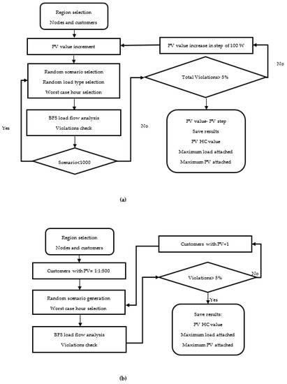 The general methodology used for hosting capacity determination is presented in Figure 1, the details of the proposed MC algorithm developed in MATLAB platform are shown in Figure 2a, and different steps are described below.