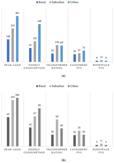 The calculation of HC w.r.t two loadings levels was initiated by generating the hourly annual load profiles for a year, as described in Section 3. The loading profiles were then scaled by using a scaling factor for 100% and 50% of the transformer rating. The annual hourly loading profiles at each node in the network were used for estimating the maximum feeder load of the network that was compared with the 100% and 50% of the transformer rating. Thus, the comparison of the peak load with the transformer rating revealed the lower value of maximum load, and thus the maximum load of the network was scaled up by using a scaling factor. The selection of the scaling factor played a central role in the accurate determination of the HC of the network and it is defined here as the ratio of the transformer apparent power to the peak feeder load. The apparent power of the transformers was distinct for each region, and therefore the scaling factor varied for each of the investigated regions. Similarly, the scaling factor for 100% and 50% of the transformer rating was different, leading to the different values of PV HC. The research results depicted that HC values w.r.t peak load and energy consumption were highly skewed by almost doubling in magnitude with maximum load as 50% of the transformer rating as compared to 100% of the transformer rating.