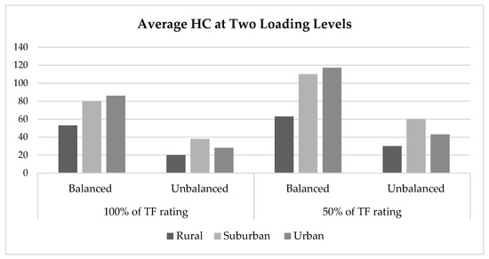 HC of the balanced PV deployment case was higher than the unbalanced PV case for all the regions. In the case of a balanced PV connection, the HC was primarily limited by the voltage violations in the rural region, and the transformer overloading (E3) became the major limiting factor in the case of suburban and urban regions, as shown in Table 5. The unbalanced PV scenario presented negative sequence voltage unbalance (E4) as the main limiting factor for integrating a large amount of PV in the LV system for rural and suburban regions. However, the neutral wire ampacity (E5) remained the dominating limiting factor with the calculation of the HC of urban areas for an unbalanced PV deployment scenario. Moreover, the overvoltage limit did not prove to be as restricting in the case of unbalanced PV scenarios in rural regions where the most dominant limiting factor was observed as negative sequence voltage unbalance (E4). Additionally, transformer overloading (E3) appeared as the major limiting constraint for the PV penetration in the case of a balanced PV scenario for 100% and 50% loading levels in the urban region. Figure 4 shows the average HC at two loading levels by averaging all of the percentage estimates in Table 6. It shows that the HC at 50% loading level of the transformer rating outscored the HC value at 100% loading level of the transformer rating.