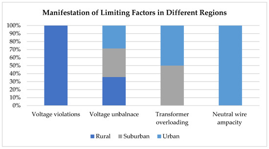 Overall, the voltage violation was observed as a key limiting factor for increased PV integration in the rural areas, and the transformer overloading noticeably limited the PV integration in the suburban and urban regions, as shown in Figure 5. The negative sequence voltage unbalance appeared as the limiting factor in all three regions, while the neutral wire ampacity limited HC of the urban region.