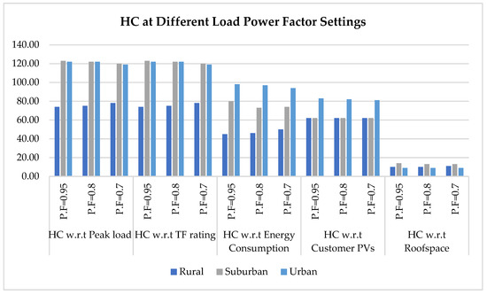 The HC values w.r.t peak load and the energy consumption were greatly dependent on the peak load of the network, as depicted in Equations (2) and (3), respectively. Thus, scaling the peak load w.r.t transformer rating generally impacted the HC w.r.t these two references without significantly impacting the other reference definitions.
