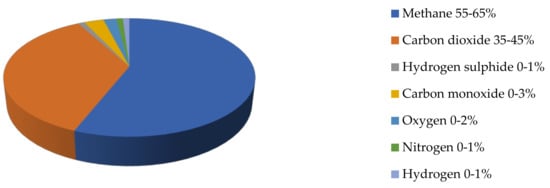 The main factors influencing the concentration of odors in the air are the rate of emission and dispersion of gases, which are directly affected by atmospheric conditions (temperature, wind direction, and atmospheric pressure) and geomorphological conditions [10]. The most odor-nuisance areas in the wastewater treatment plant include pretreatment unit—raw wastewater tanks, coarse and fine screen, and sand traps—preliminary settling tanks and sludge management facilities—sludge tanks, and sludge dewatering halls [5,7,11]. Preliminary sedimentation tanks and sewage sludge tanks generate the largest amounts of odors due to the large area of these objects and the emission of gases from their entire surface [12]. Excessive sewage sludge generated in the wastewater treatment process is characterized by a high efficiency of rotting. For their disposal or further use, e.g., for land reclamation, it is necessary to stabilize the sludge and deprive it of pathogenic organisms. For this purpose, the excess sludge is directed to hermetic fermentation chambers, where the four-stage process of anaerobic fermentation takes place, with the participation of several groups of anaerobic bacteria. These bacteria break down complex organic substances (proteins, fats, and carbohydrates) into methane and carbon dioxide. In the fermentation process, the collected biogas can be used to produce heat and electricity [13,14] but before that, it must be purified [15]. Biogas resulting from fermentation consists mainly of methane and carbon dioxide as well as trace amounts of hydrogen, carbon monoxide, nitrogen, oxygen, and hydrogen sulfide (Figure 1), in order to be used for energy production in installations, it must meet the appropriate requirements adapted to such devices as engines and boilers, therefore it is necessary to clean them, also to increase their calorific value [16].