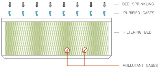 Deodorization by biofiltration, as shown in Figure 2, consists in passing a humidified, contaminated gas through a solid bed containing microorganisms capable of odors and VOCs degradation. The pollutants are sorbed and then absorbed by bacteria and decomposed into water and carbon dioxide [20]. In most cases, the biofilter bed consists of organic materials: wood bark, peat, straw, loosened soil, compost, coconut fiber, and activated carbon. The biofilter bed is piled up from one to several layers in such a way as to ensure contact of the entire gas stream with the bed and to maintain uniform aeration of the bed in order to prevent the growth of anaerobic bacteria, causing the bed to rot [19]. Bacteria, which have a natural ability to degrade odor and VOCs pollutants, form a biofilm on the surface of the biofilter bed and are selected according to the composition of pollutants present in the gas passing through the biofilter. In addition, they are provided with appropriate conditions for growth and development, e.g., by maintaining an appropriate pH in the bed and regularly supplying nutrients and mineral salts. Microorganisms are selected in such a way as to ensure their greatest diversity, which will enable the degradation of the widest range of pollutants [14]. Biofilters are a commonly used method of purifying gases from odors and VOCs emitted by the municipal sector because this method effectively removes both organic pollutants, including aromatic hydrocarbons (toluene and xylene), alcohols, aldehydes, organic acids, and amines as well as inorganic compounds such as hydrogen sulfide and ammonia. However, in the case of inorganic pollutants, it is necessary to control their concentration, due to the products formed as a result of their decomposition, which cause acidification of the biofilter environment. Moreover, the biofiltration method has some limitations on the concentration of pollutants in the treated gas. Biofilters are usually used for treatment of relatively large gas streams [4] (according to practice they are usually used for flows up to 5000 m3/h), therefore they require a large mass exchange area and consequently a large size biofilter. The main disadvantages of biofiltration are the difficulty of controlling the process—maintaining the appropriate humidity and pH of the bed (which may become acidic)—as well as clumping of the filter material, relatively large installation size and lower treatment efficiency at high concentrations of pollutants. On the other hand, the advantages include low operating and investment costs, the possibility of purifying large streams of gases at low concentrations of pollutants [4,28].