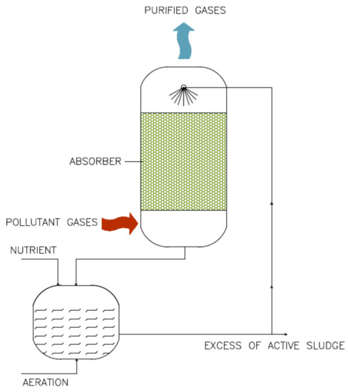 The principle of bioscrubber operation is based on two main stages that usually take place in separate devices [25]. In the first tank—the absorber—gaseous pollutants are absorbed into the liquid phase, which then goes to the second tank—the bioreactor. The bioreactor is filled with an aqueous suspension of microorganisms in which biodegradation of pollutants takes place. The liquid circulates through tanks supplied with air, nutrients for bacteria and pH adjusting solutions, while the excess of activated sludge is drained outside the system. The principle of operation and the structure of the bioscrubber are shown in Figure 3. The absorbers are filled with a bed that acts as a carrier for microorganisms. On the surface of the filling, microorganisms form a biofilm consisting of clumped bacterial cells and extra cellular polymeric substances (EPS) [29] capable of colonizing various environments and surfaces [30,31]. The undoubted advantage of bioscrubbers is the ability to control their operating parameters, such as pH, nutrient solution, aeration, which directly stabilizes their work. In addition, the installation is characterized by small dimensions, which is a significant advantage compared to biofilters, and there is no problem of clogging of the filter material. However, bioscrubbers generate large amounts of by-products such as excess sludge and contaminated, recirculated liquid; moreover, the operating costs of maintaining such an installation are much higher than in the case of biofilters [4,32].