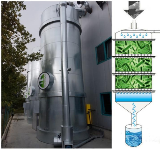 Very broadly, Kasperczyk et al. described the use of Compact Trickle Bed Bioreactors to purify gases from VOCs and odors of various origins. Contaminated gases supplied to the reactor, which are the main source of carbon for bacteria, are absorbed into the liquid phase, and then diffuse into the bacterial biofilm inhabiting the reactor bed. In bacterial biofilm as a result of the metabolic activity of microorganisms, they are transformed into simple products such as water and carbon dioxide [20]. Nutrients needed by microorganisms for proper development are delivered in the form of a solution of mineral salts along with the liquid recirculated in the reactor, which constantly moistens the surface of the bed. An important advantage is the ability to control the conditions in the reactor, such as maintaining the appropriate pH, the composition of mineral salts, which ensure good conditions for the development of microorganisms, and temperature. Moreover, Compact Trickle Bed Bioreactors do not generate additional waste in the form of secondary pollutants, and are also a relatively inexpensive technology, which is conditioned by their operation at ambient temperature and atmospheric pressure [53]. Figure 5 shows a full-scale industrial Compact Trickle Bed Bioreactors.