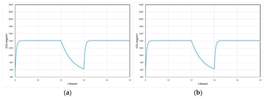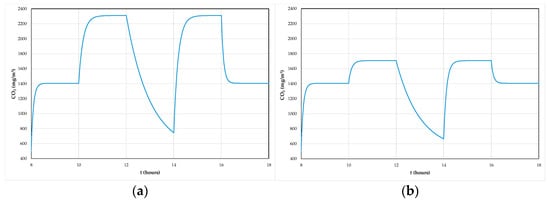 According to the mass balance integral equation (carbon dioxide concentration and water vapor) presented earlier, this numerical simulation takes into account the inlet mass from the outdoor environment to the indoor environment, the outlet mass from the indoor environment to the outdoor environment and the mass generation in the human breathing process to the indoor environment. The mass inlet and the mass generation are well mixing in the occupied space. When the mass inlet is higher than the mass outlet, the mass in the space increases, and when the opposite is verified, the mass in the space decreases. The inlet airflow, equal to the outlet airflow, is responsible for the evolution of the mass. Thus, when the airflow rate increases or the mass generation decreases, the mass decreases, and when the airflow rate decreases or the mass generation increases, the mass increases.
