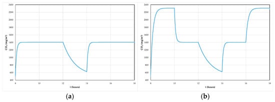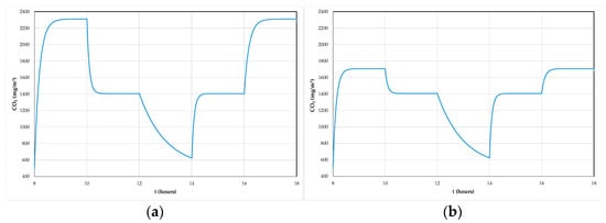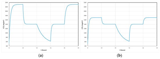 The measurements of indoor carbon dioxide (CO2) concentrations can be used to evaluate indoor air quality and ventilation system performance [30,31,32]. The relationship between CO2 concentration and the airflow rate, under steady-state conditions, is presented in ASHRAE Standard 62.1 [33]. The acceptable level of indoor air quality referred by this standard is given by a value of CO2 concentration below 1800 mg/m3 [33].