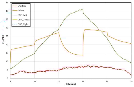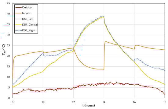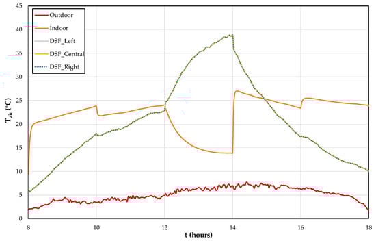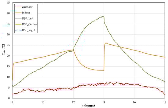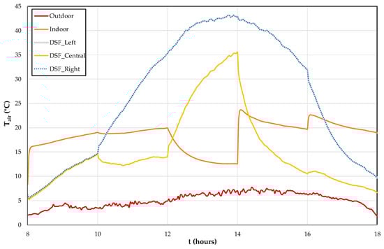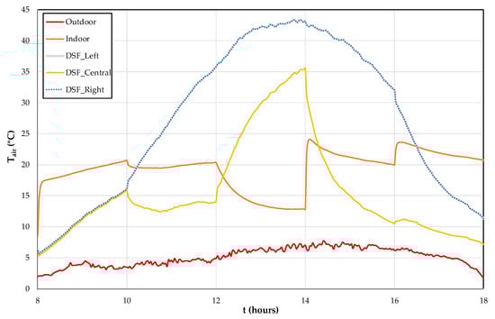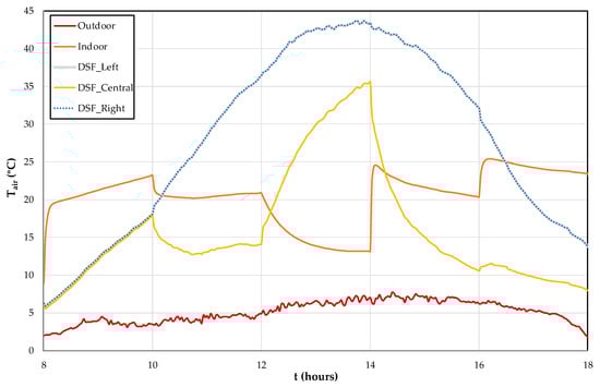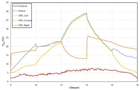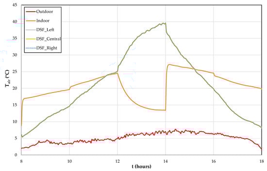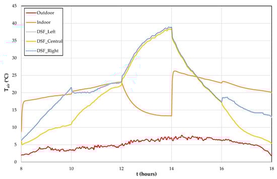 In general, the air temperature inside the DSF system increases during the morning period, then increases significantly during noon and finally decreases during the afternoon period. The increase is due to the solar radiation and the extra increase during noon is due to lack of ventilation.