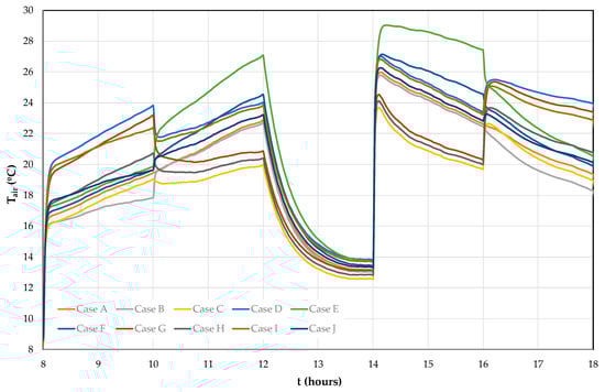 Figure 23 shows that Case E presented the highest value of the virtual chamber internal air temperature in the second period of the morning and in the first period of the afternoon. Case D presented the highest value of the virtual chamber internal air temperature in the first period of the morning and in the second period of the afternoon. Case C presented the smallest value of the virtual chamber internal air temperature in the second period of the morning and in the first period of the afternoon. Case B presented the highest value of the virtual chamber internal air temperature in the first period of the morning and in the second period of the afternoon. In order to promote the best thermal comfort conditions, it is necessary to increase the indoor air temperature during the entire day. However, this fact is analyzed in detail through the cold uncomfortable hours in the next section.