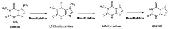 Batista et al. have identified Aspergillus genusas as one of filamentous fungi that develop naturally on coffee beans [34]. The mechanism of the degradation of caffeine by Aspergillus strains has been described by Gummadi et al. as successive demethylation of caffeine into 1,3-dimethylxanthine, theophylline, into 3-methylxanthine, then, into xanthine (Figure 5) [35]. Hence, main differences explaining those results between dry and wet spent coffee grounds can be related to the presence of water in the raw material, which is thus responsible for fungal development.