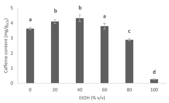 Influence of the EtOH/water ratio for the solid/liquid extraction of caffeine into spent coffee grounds (Experimental conditions: 2 g of SCG for 50 mL of hydroalcoholic solvent at 20 °C during 15 min, magnetically stirred). Values marked by the same letter are not significantly different (p < 0.05) according to the Student test (t-test).