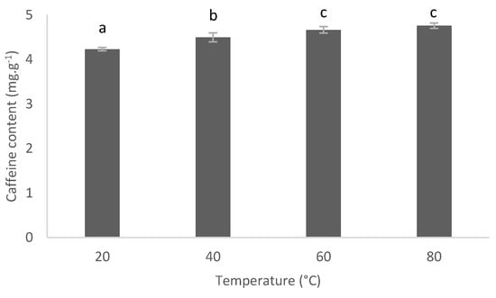 Temperature influence between ambient temperature (20 °C) and temperature close to ethanol boiling point (80 °C) was investigated on caffeine extraction (Figure 7). A slight increase (+11%) was observed between 20 °C (4.23 mg.g−1 SCG) and 60–80 °C (4.67–4.76 mg.g−1 SCG).