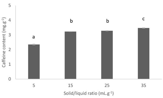 The solid/liquid ratio (5–35 mL.g−1) of caffeine extraction was studied (Figure 9). The major difference was observed between 5 mL.g−1 (2.35 mg.g−1SCG) and 15 mL.g−1 (3.23 mg.g−1 SCG). The Student test does not show that a variation of the solid/liquid ratio from 15 to 25 mL.g−1 significantly increase caffeine extraction (p < 0.05). The experiments could be therefore performed with a 15 mL.g−1 ratio in order to reduce solvent consumption.