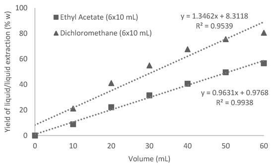 The influence of the volume of ethyl acetate with 6 × 30 mL compared to 6 × 10 mL to treat 60 mL of aqueous extract has been reported during liquid/liquid extraction (Figure 11). The curve of the yield has shown quite linear increases even up to 6 × 30 mL of ethyl acetate. Better results with 6 × 30 mL have reached 93.4% of extraction yield. By increasing the volume, solvent of extraction is not saturated in solute, thus, coefficient distribution is increased in favor of the solvent of extraction. Results with 6 × 30 mL of ethyl acetate are competitive with those obtained with 6 × 10 mL of dichloromethane.