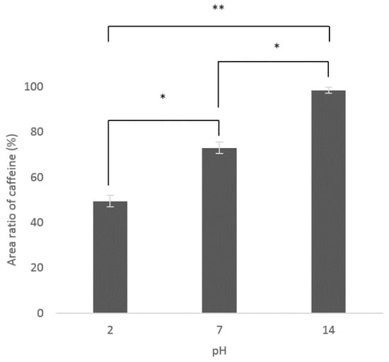Influence of the pH on the area ratio of caffeine of liquid/liquid extraction of aqueous extract (60 mL) treated with ethyl acetate (60 mL) at room temperature. Values marked by the symbol * are significantly different (p < 0.05) according to the Student test (t-test). Values marked by the symbol ** are significantly different (p < 0.01) according to the Student test (t-test).