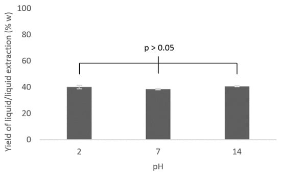 Influence of the pH on the yield of liquid/liquid extraction of aqueous extract (60 mL) treated with ethyl acetate (60 mL) at room temperature. All the values are not significantly different (p < 0.05) according to the Student test (t-test).