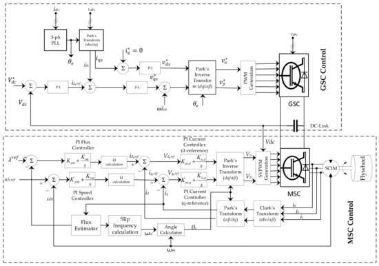 The GSC acts as a rectifier or an inverter during acceleration and deceleration modes, respectively. Additionally, it regulates the DC-link voltage and the reactive currents exchanged with the electric grid. In contrast, when a disturbance occurs in an electric grid, the flywheel starts to decelerate (discharge), the GSC acts as an inverter and MSC operates as a rectifier.