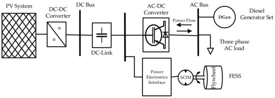 A PV solar system cannot meet the energy demand alone for 24-h during the day due to variations in solar irradiance, particularly during nighttime. Therefore, integration of a DGen or appropriately sized ESS or both can meet the required load demand for 24 h and keep the system stable. In most cases, both DGen and ESS are needed since it is unlikely an ESS on its own can provide several hours of no photovoltaic energy supply let alone days or weeks that could occur during periods of inclement weather. Such a photovoltaic hybrid system can be used to facilitate rural electrification where there are weak grid systems or extension of existing conventional grids is an expensive option with increasing electricity demand in developing world. It is proposed and will be demonstrated with supporting results that FESS would be the feasible technology for providing back-up power which leads to reduced operation of diesel engine resulting in less emissions and reduced fuel burn. The storage capacity of the flywheel technology is independent of temperature fluctuations, therefore, contrary to batteries, it would be a suitable alternative for the islanded grid system in the countries with high temperatures []. The application of a PV hybrid mini-grid system (PVHMS) consisting of PV system, DGen and the FESS technology for applications in small towns located in remote areas was hence studied. A schematic diagram of PVHMS studied in this paper is shown in Figure 3.