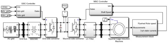 The flywheel storage system has three modes of operation which are charge, discharge and standby. The flywheel is said to be in stand-by mode when no energy conversion occurs and the flywheel runs at an optimum speed except for the marginal speed decrease due to standby losses. During charging mode, the flywheel converts electrical energy into kinetic energy, when there is disturbance in the electric grid, the flywheel starts to discharge and converts kinetic energy back into electrical energy. The flywheel rotor is assumed as an added inertia coupled with the shaft of SCIM. The position of the flywheel and speed are controlled by MSC that is connected to the grid side converter (GSC) through a DC-link capacitor. MATLAB/Simulink model of FESS is shown in Figure 4.