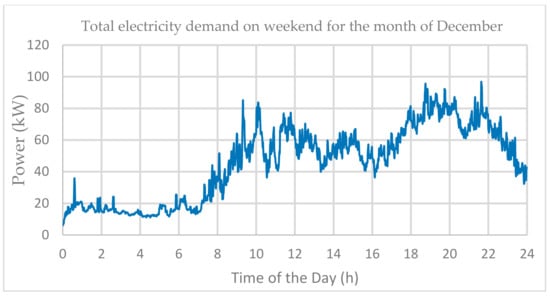 Figure 9 presents load profile 3 for the month of December on weekend. The electricity consumption is high during morning between 9:00 to 11:00 (85 kW) and during evening between 18:00 to 22:00 (98 kW). The load demand has some random peaks and dips during the day. The solar irradiance corresponding to the load demand on weekend is shown in Figure 10, it can be seen that before 7:00 in the morning and after 17:00 in the evening there is no sun and PV cannot meet the load demand. During these periods of time, the DGen and FESS can play their roles keeping the system stable by satisfying the load demand at all instances. It can also be seen the solar irradiance is fluctuation during entire day. The peak solar irradiance appears for barely 30 min. between 11:00 and 12:00.