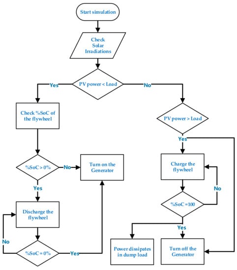 The output power of the PV system is proportional to input solar irradiance (W/m2). When photovoltaic power output reduces, MSC allows the FESS to provide the power back to DC bus. In the load profiles presented above (Figure 6, Figure 8 and Figure 10), output of the PV system is zero because of the zero-input solar irradiance from 00:00 in the midnight till 6:00 in the morning. During this time there is very less total electricity demand due to less activities in the dwellings. Therefore, at nighttime, the DGen can be used to meet the load demand and charge the flywheel. The DGen will only operate until flywheel is charged enough to meet the load demand or the PV system generates enough power compared to the electricity consumption. During the day when there is maximum solar irradiance and the PV produces more power than the residential load power, the excess power can be used to charge the flywheel in order to store the kinetic energy. The stored energy can be converted into the electrical energy which can be used to feed the residential load when the power generated by PV system is not sufficient. Figure 11 shows the concept map of the proposed logic control scheme studied in this paper.