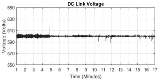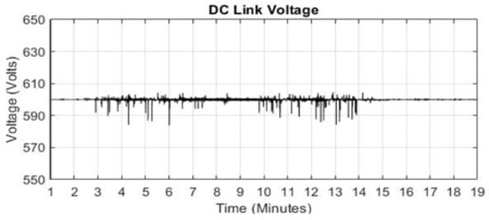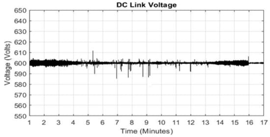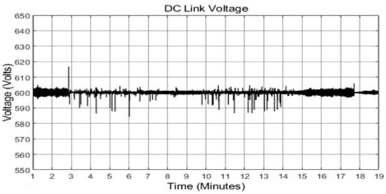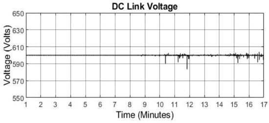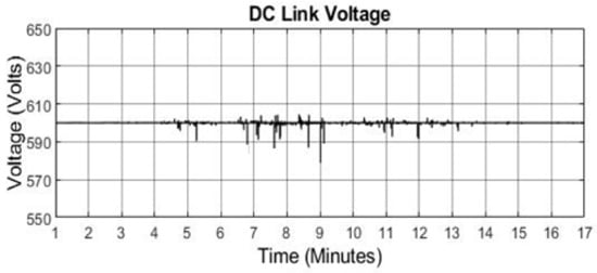 Figure 12 shows the power curves of the load demand, DGen and PV system. The load profile 1 is simulated for 19 min. The portion of the load profile is selected for the time when surplus energy from PV system will be available due higher solar irradiance (Figure 6). Surplus energy can be sore in the flywheel and can be converted back to share the load demand with PV. It can be seen that the load demand is not significant within the period 1–2.5 min and here, PV output is zero. However, the DGen must be on providing power. The maximum power generated by PV system occurs in the period 6.5–10 min, at this time the load demand is less than the PV. Therefore, the excess power generated by PV system is dissipated in the dump load and during this time the DGen remains off. After 12.5 min the PV output starts to decrease and the load demand is increasing therefore the PV system struggles to meet the load demand and generator is turned on. The maximum demand of 100 kW appears after 15 min when PV output is zero due to no solar irradiance during and the maximum demand is also supplied by the DGen. The system operates stably for 19 min which can be seen from stable DC link voltage in Figure 13. The spikes seen in the figure are due to switching effects of the power sources and power transfer between them. Figure 14 shows the three phase currents of the DGen during the 19 min time period, with a detailed view of the currents around a time of 18 min.