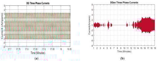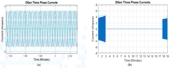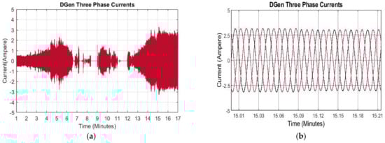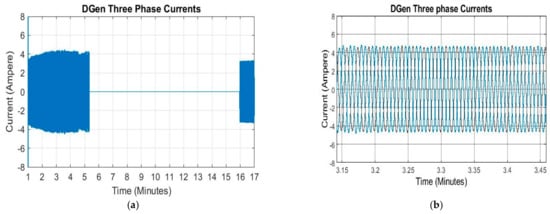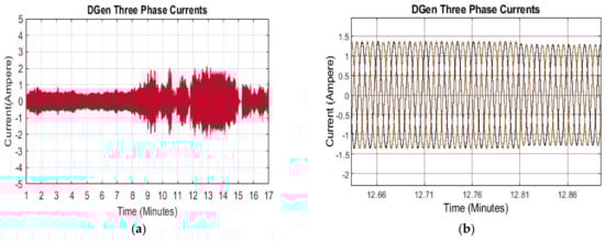 (a) Zoom in view of three phase currents. (b) Three phase currents of DGen.