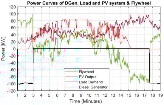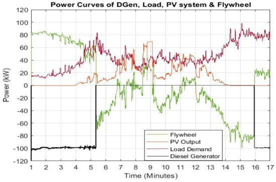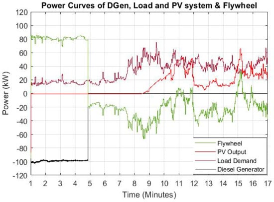 Combined power curves of Load, PV system, Flywheel and DGen.