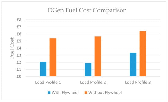 Comparing the operation of the system with and without FESS for the load profile 3 (Figure 16 and Figure 28) it can be clearly seen that the FESS has considerably reduced the operation of DGen from approximately 13.5 min to 5 min. Additionally, the operation with the FESS has saved the CO2 emissions and the fuel cost. The fuel consumption analysis of the DGen with and without the FESS is provided in the next section.