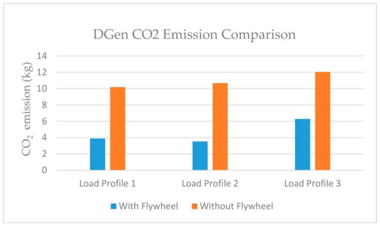Figure 33 presents the CO2 emission analysis; it can be seen that there is huge reduction in carbon emissions with integration of flywheel technology in PVHMS. In the case of load profile 3 without the flywheel, the DGen emits 12 kg of CO2 during 17 min of operation, which drops to 6.1kg of CO2 when flywheel is added in the system. The significant drop can be seen in case in load profile 1 and 3 as well. However, the emissions can further be reduced if size of the energy storage is increased or another type of ESS is integrated in the system besides the flywheel such as battery system.