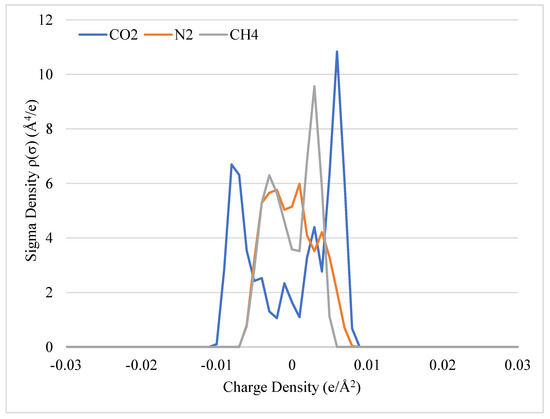 Sigma profiles of non-polar gases can be seen in Figure 2. For the non-polar gases, the key difference in the sigma profiles of the molecules is the charge density distribution of CO2 vs. N2 vs. CH4. N2 and CH4 have most of their area concentrated around the zero-x-axis compared to CO2. CO2 is considered a non-polar gas, since the distribution of the charges for CO2 are weighted between ±0.0082 e/Å2. However, CO2 can be influenced by its environment to make it behave more like a polar molecule and participate in hydrogen bonding or behave more like a non-polar molecule and participate in van der Waals interactions. The potential for this behavior can be seen in the sigma profile as the charge density is concentrated closely to the ±0.0082 e/Å2 boundary. It is also understood that CO2 contains two polar bonds, but the linear structure of the molecule creates a net-zero dipole moment. However, in a polar environment such as CO2 in water, it behaves as an acid gas.