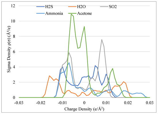 Regarding polar gases, only gases reported as impurities of biogas are selected for this study. There exist large variations in profiles among this group, as seen in Figure 3. The most notable impurity is water, which reaches the farthest among the other gases on the charge density and is relatively symmetric, which concludes its adaptability in assuming the roles as a Lewis acid or base. Acetone has a large peak near the 0 e/Å2 yet behaves as a Lewis base due to the considerable peak beyond 0.01 e/Å2. H2S is relatively evenly dispersed along the x-axis, suggesting it can participate in both van der Waals interactions and hydrogen bonding depending upon its environment. SO2 is heavily concentrated around the boundaries of ±0.0082 e/Å2, and as such, would be expected to have lower solubility among the less polar DES. Ammonia is a weak base, and this is indicated in the large peaks near the HBA region (−0.0082 e/Å2) but is capable of hydrogen donating interactions, as seen in the trailing area in the positive region of the plot as it extends to nearly 0.03 e/Å2.