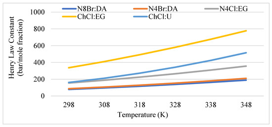 The selectivity thus far has been discussed at 25 °C, however, temperature of the biogas could be as high as 55 °C depending on mesophilic or thermophilic microorganisms. Therefore, the effect of temperature on selectivity at infinite dilution is of practical interest. Figure 5 has shown the effect of temperature on Henry’s Law constant, which is analogous to selectivity. Due to the unit of the Henry constant, the lower values are associated with higher solubility. With the increase of temperature, the Henry’s Law constant increases. Interestingly, for the same HBA (e.g., ChCl), exceptional deviations in Henry’s Law constant can be found for different HBD (e.g., urea versus ethylene glycol). This is probably due to the smaller HBA chain lengths that might have a naturally smaller affinity for CO2 [41]. However, the induced polarity phenomena have a stronger impact on the solubility outcome. This is due to CO2 being naturally non-polar, as seen in Figure 2. Thus, the magnitude of the dipole moment of a solvent will determine the affinity CO2 will have for it.