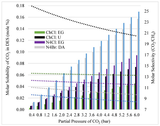 Effect of pressure on selectivity of CO2 vs. CH4 and solubility of CO2 at equilibrium and 25 °C for each DES. Y-axis 1 is the solubility and y-axis 2 is the selectivity. The dotted lines coincide with y-axis 2 and the bars coincide with y-axis 1. The partial pressure is the same for CO2 and CH4.