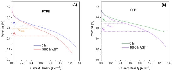 Polarization curves of the single cell assembled with fresh (0 h) and stressed (1000 h AST) PTFE- (A) or FEP-based (B) GDMs. AST: accelerated stress test.