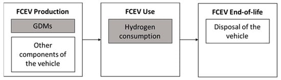 Considering the effect of the GDM degradation on the durability performance of an FC is, therefore, fundamental for a reliable evaluation of the environmental impact of the vehicle. This work investigates the role of GDM degradation via LCA for the first time. First, an extensive review of the scientific literature is performed to uncover how fuel-cell durability and performance losses are considered in the LCA studies of FCEVs. Then, supported by the experimental results acquired in previous work by the authors [13], the role of these parameters in affecting the LCA of an FCEV is investigated. For the aforementioned reasons, only the experimental results from mechanically stressed samples were used for the assessment. To assess how the mechanical degradation of GDM can be affected by the choice of the hydrophobic agent, the GHG implications of replacing PTFE with fluorinated ethylene propylene (FEP) are also investigated. In previous experiments, FEP proved to be capable of reducing mass-transfer resistances at a high current density, thus enhancing water management and output power [19,20]. Moreover, thanks to a lower melting point, the use of FEP allows us to decrease the sintering temperature of the coated GDM from 350 °C (for PTFE-based GDMs) down to 260 °C [21]. Despite these clear environmental benefits, the overall GHG consequences of replacing PTFE with FEP in the GDM of an FCEV have not been assessed before. The results of the present work are intended to provide new information for policymakers, scientists, and car manufacturers on the GHG emissions of FCEVs and suggest potential ways to reduce them.