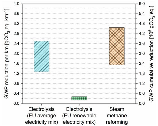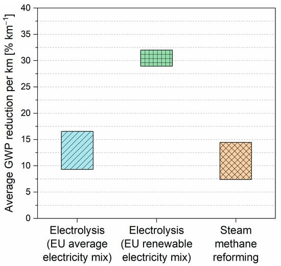 In the use phase, only the impacts of hydrogen consumption are considered. The amount of hydrogen consumed was experimentally calculated as explained in Section 2.4. The fuel consumptions shown in Table 2 were used for the assessment. Hydrogen production via different pathways was modeled based on Bieker et al. [36]. In their study, the electricity consumption for hydrogen production via electrolysis (including compression and dispensing) amounted to 1.68 MJ per MJ of hydrogen [36]. The life-cycle carbon intensity of EU electricity was set by Bieker et al. as 199 g of CO2 eq. kWh−1 [36], assuming that the electricity mix during the service life of the vehicle will progressively decarbonize. The vehicle was assumed to start operating in 2021, and the Stated Policy Scenario of the IEA’s World Energy Outlook was used for the estimate [37]. The carbon intensity of the EU renewable energy was estimated to be 23 g of CO2 eq. kWh−1, considering a mix composed of 33% of solar energy and 67% of wind energy [36]. Finally, the carbon intensity of hydrogen production via steam reforming was assumed to be 113 g of CO2 eq. MJ−1 of hydrogen [36]. A lower heating value for hydrogen of 120 MJ kgH2−1 and an electrolyzer efficiency of 57 kWh kgH2−1 were assumed for the study [36]. Maintenance and tire emissions were neglected since previous studies showed their role in the life-cycle impacts to be trivial [9].